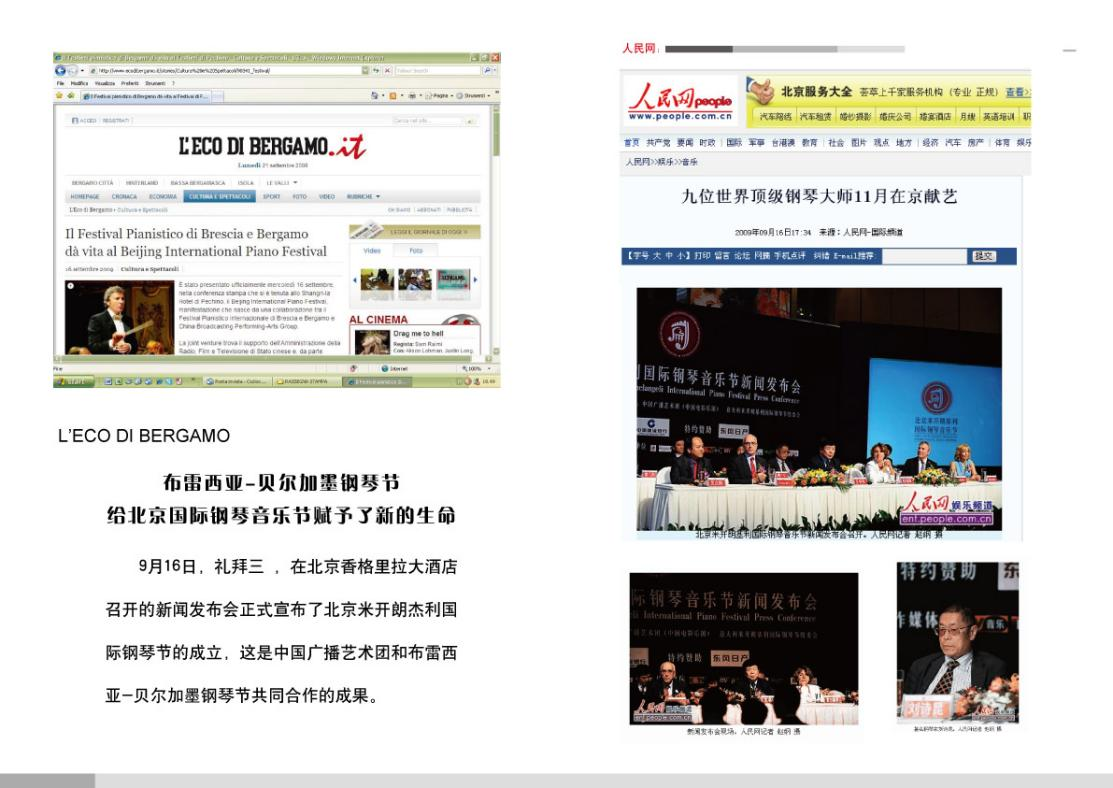 由中國廣播藝術團和意大利布雷西亞暨貝加莫國際鋼琴節組委會聯合主辦的第二屆北京國際鋼琴音樂節于2010年11月18日到29日在北京舉行。為期12天的北京國際鋼琴音樂節以“心感動 樂人生”為主題,推出紀念肖邦、舒曼誕辰200周年鋼琴協奏曲選拔賽,12場大師音樂會,大師見面會等一系列活動。包括陳薩、莉莉亞·齊柏絲、杰哈德·歐匹茲等在內的來自世界各地的10余位頂級鋼琴大師聯手獻上精彩演出。