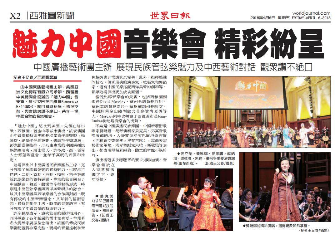 2018年3月29日,《魅力中國》美國巡演在洛杉磯好萊塢杜比劇院舉行。在著名指揮家彭家鵬的指揮下,《金蛇狂舞》《北京喜訊到邊寨》等民族管弦樂,以及京胡、琵琶、二胡、笛子、嗩吶等民族樂器與樂隊的精彩表現,令現場掌聲雷動。演出積極嘗試多種藝術形式的結合,中國新藝術音樂著名女歌唱家龔琳娜的歌曲《山鬼》、《忐忑》和云南民歌《小河淌水》,著名胡琴演奏家姜克美與美國大提琴演奏家共同演繹板胡、大提琴與樂隊《花兒隨想》,梅派京劇傳人董飛以昆曲與樂隊共同演繹《皂羅袍》,優秀青年歌唱家薛浩垠蕩氣回腸的《今夜無人入睡》等精品節目,堪稱東西方音樂藝術的融合對話與和諧共鳴。