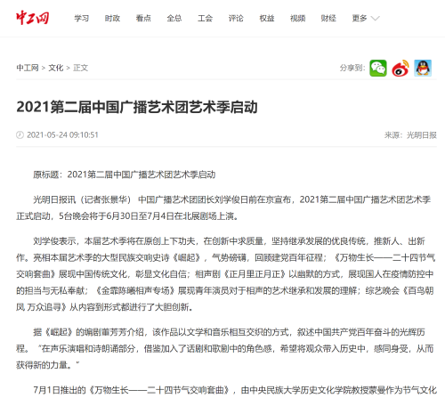 在中國共產黨建黨百年之際,中國廣播藝術團的新老藝術家齊聚一堂,以藝術家自己的方式為黨的百年華誕獻禮。新時代,新使命,新征程,中國廣播藝術團將以全新的精神面貌,重新啟程,聚合同心共筑中國夢的磅礴力量,共同實現偉大的夢想。