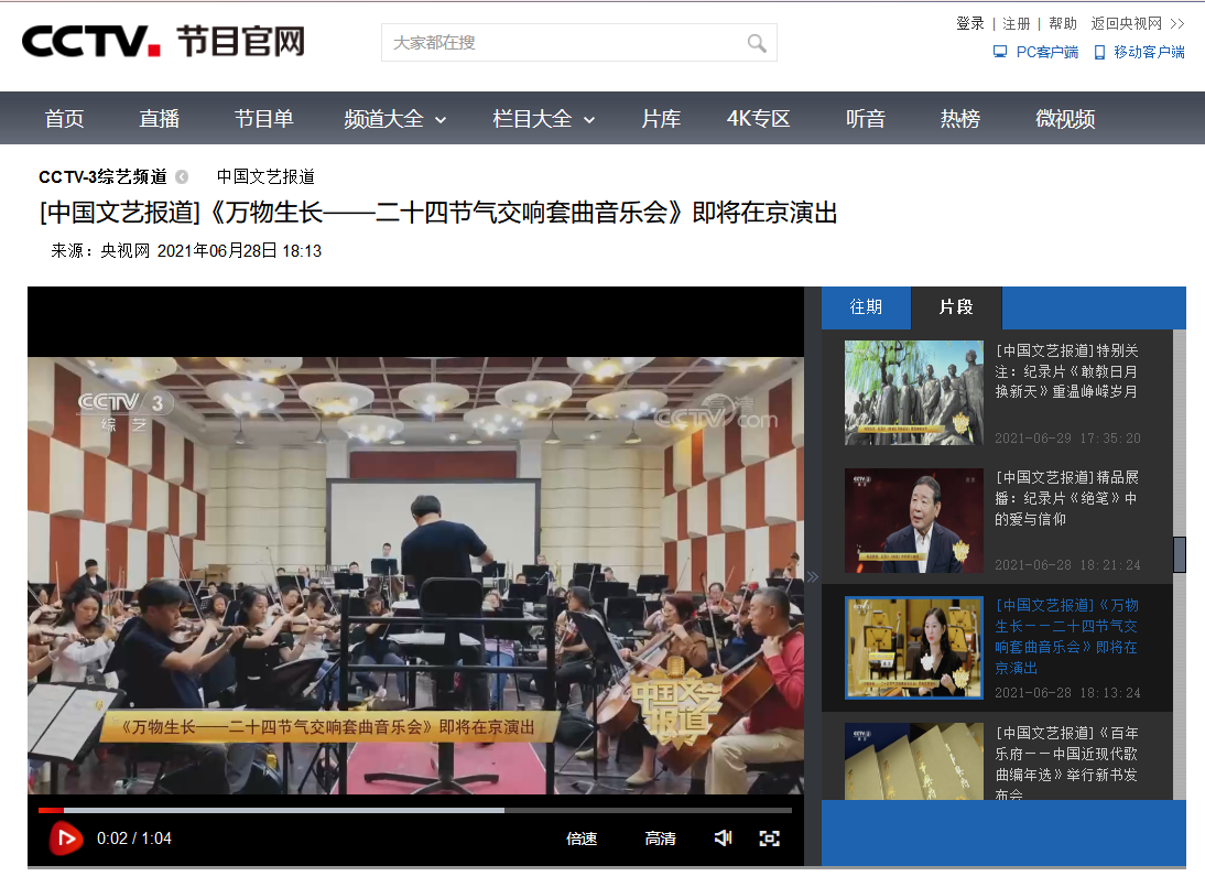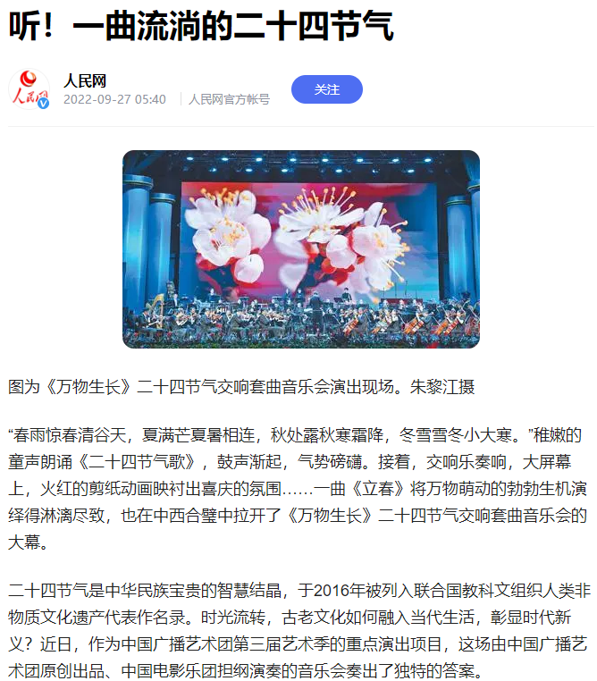 2022年3月6日,完整劇場版的二十四節氣音樂會,在順義大劇院上演, 同年4月,以《萬物生長》音樂會為核心內容拍攝的《聆聽時間的旋律》8集文化音樂短視頻在第三屆“國際中文日”線上活動亮相,音樂會濃重的中國文化氣質受到了眾多海外觀眾的喜愛,在海外平臺的播放點擊率超過200萬,互動量18萬次。