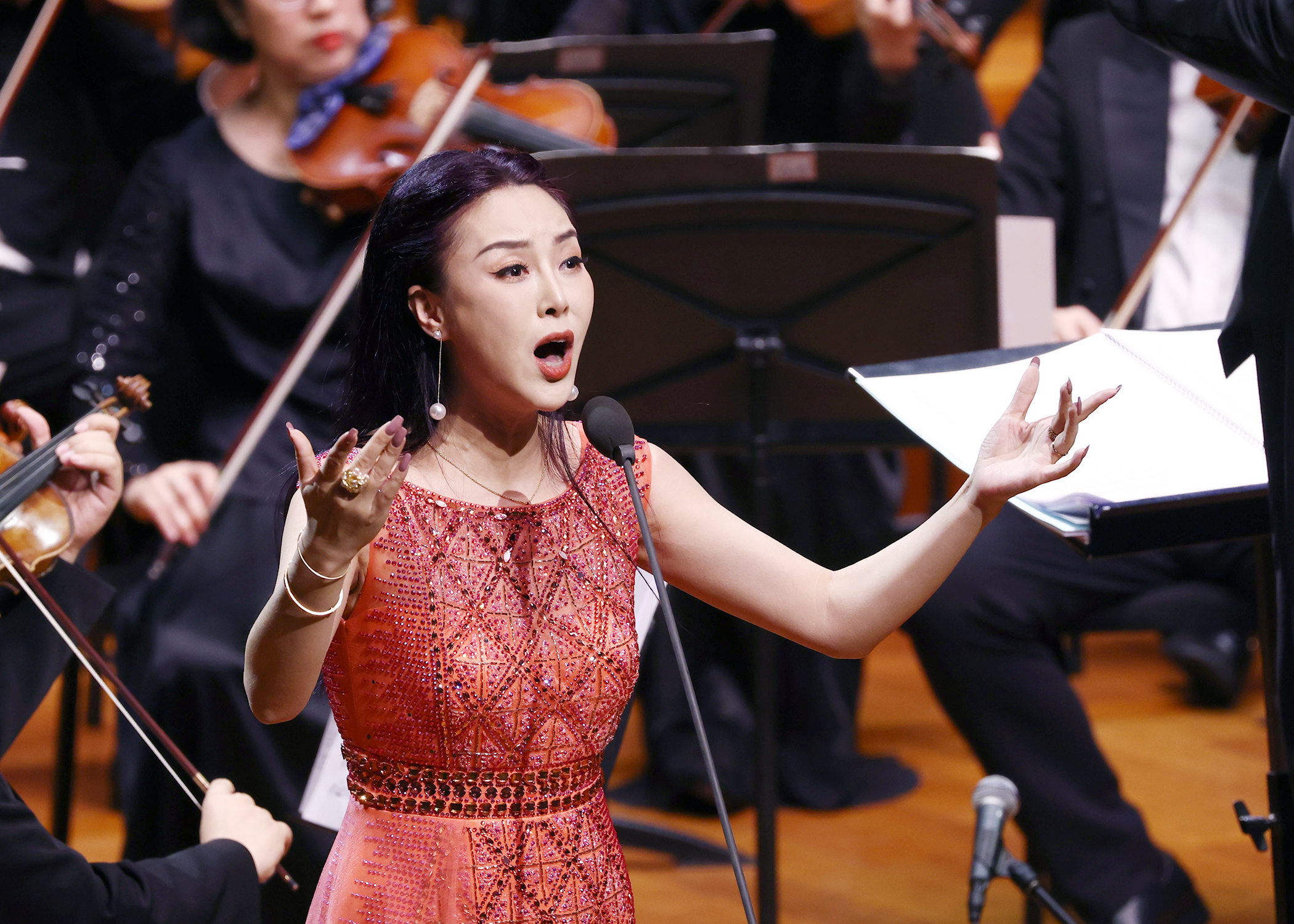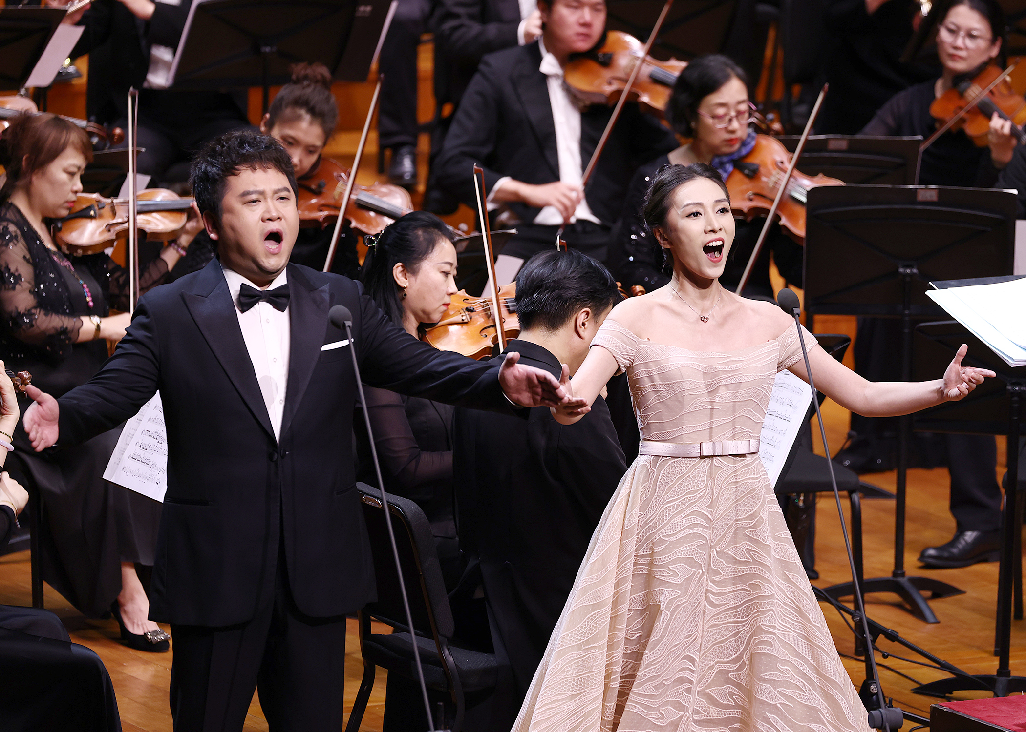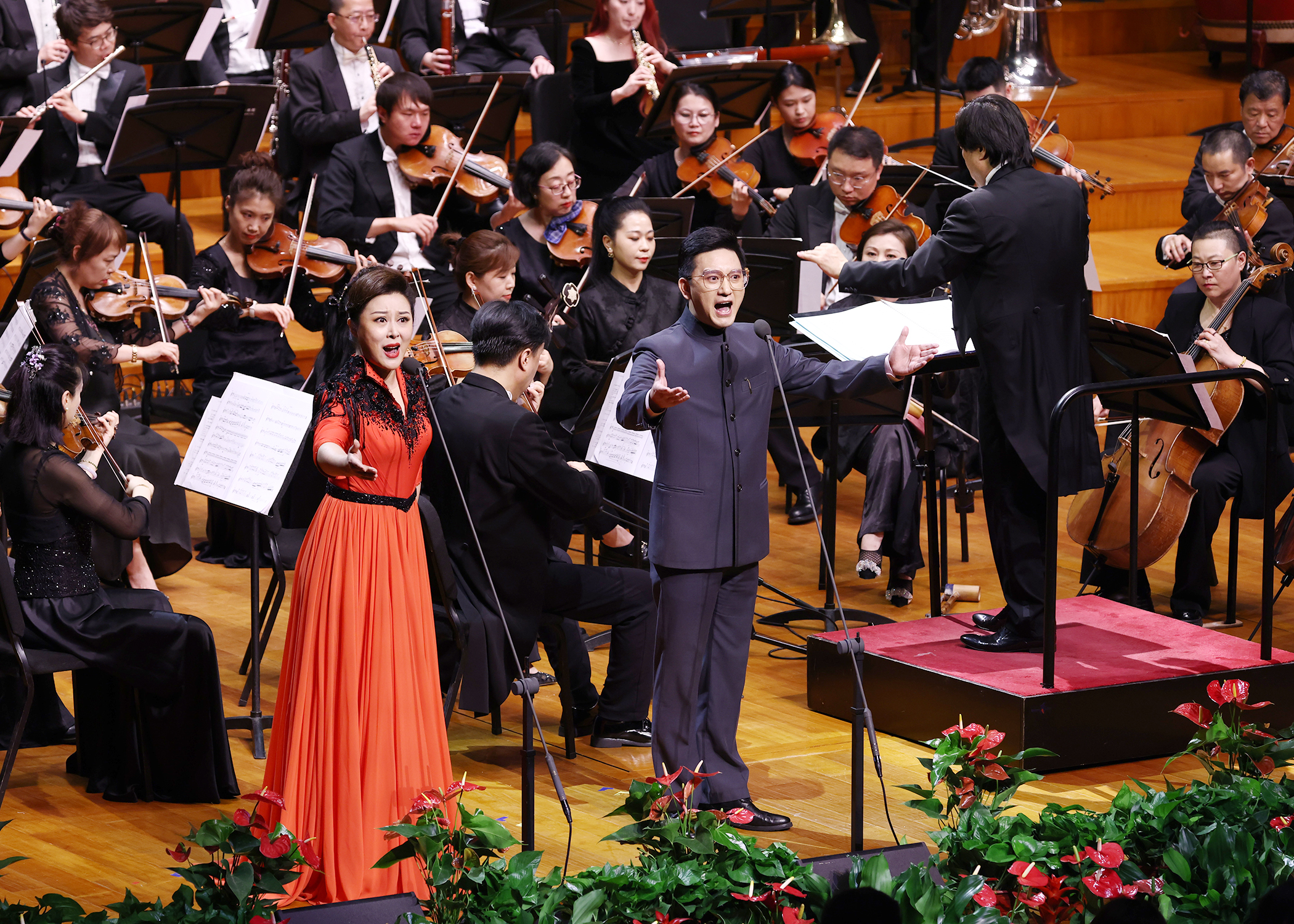 特邀京劇名家張馨月、傅希如,一位是梅派傳人,一位是余派新銳,他們聯(lián)袂演唱京劇戲歌《中華》,歌曲以京劇音樂為元素,將交響樂與京劇重唱、合唱相結(jié)合,情緒飽滿、韻味十足