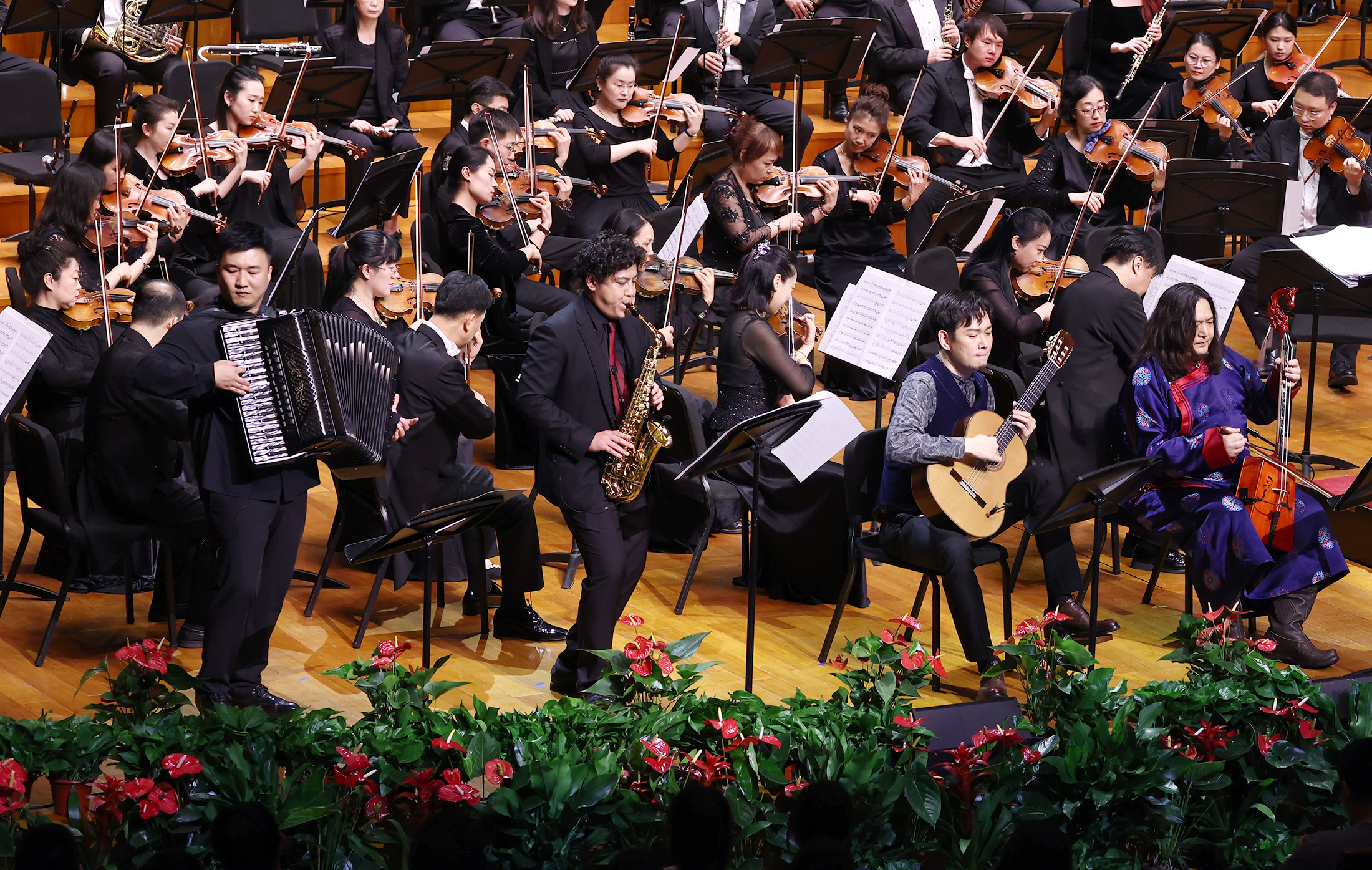 由藝術(shù)團(tuán)青年作曲家張?jiān)姌穭?chuàng)作、本次音樂會(huì)首演,頌揚(yáng)中國(guó)推動(dòng)構(gòu)建人類命運(yùn)共同體美好愿景的原創(chuàng)作品,讓代表不同地域文化、不同音樂色彩的馬頭琴、吉他、薩克斯、手風(fēng)琴等中西方樂器進(jìn)行相互對(duì)話與激情碰撞,綻放出迷人的藝術(shù)火花。