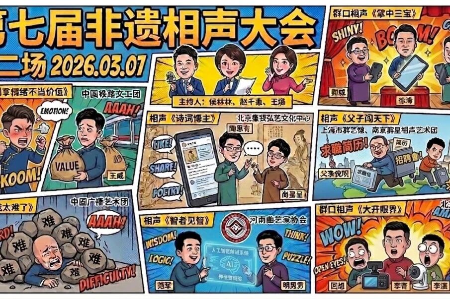 如果說首場演出的全員新作是時代的“鮮”,那么 3 月 7 日的第二場演出,則為深圳釀造了一份獨有的“甜”。這一天,笑聲不僅在劇場內鼎沸,更向城市末梢滲透,交織出一幅活色生香的煙火長卷。當晚,深圳福田喜劇藝術周暨第七屆非遺相聲大會第二場精彩繼續(xù)。